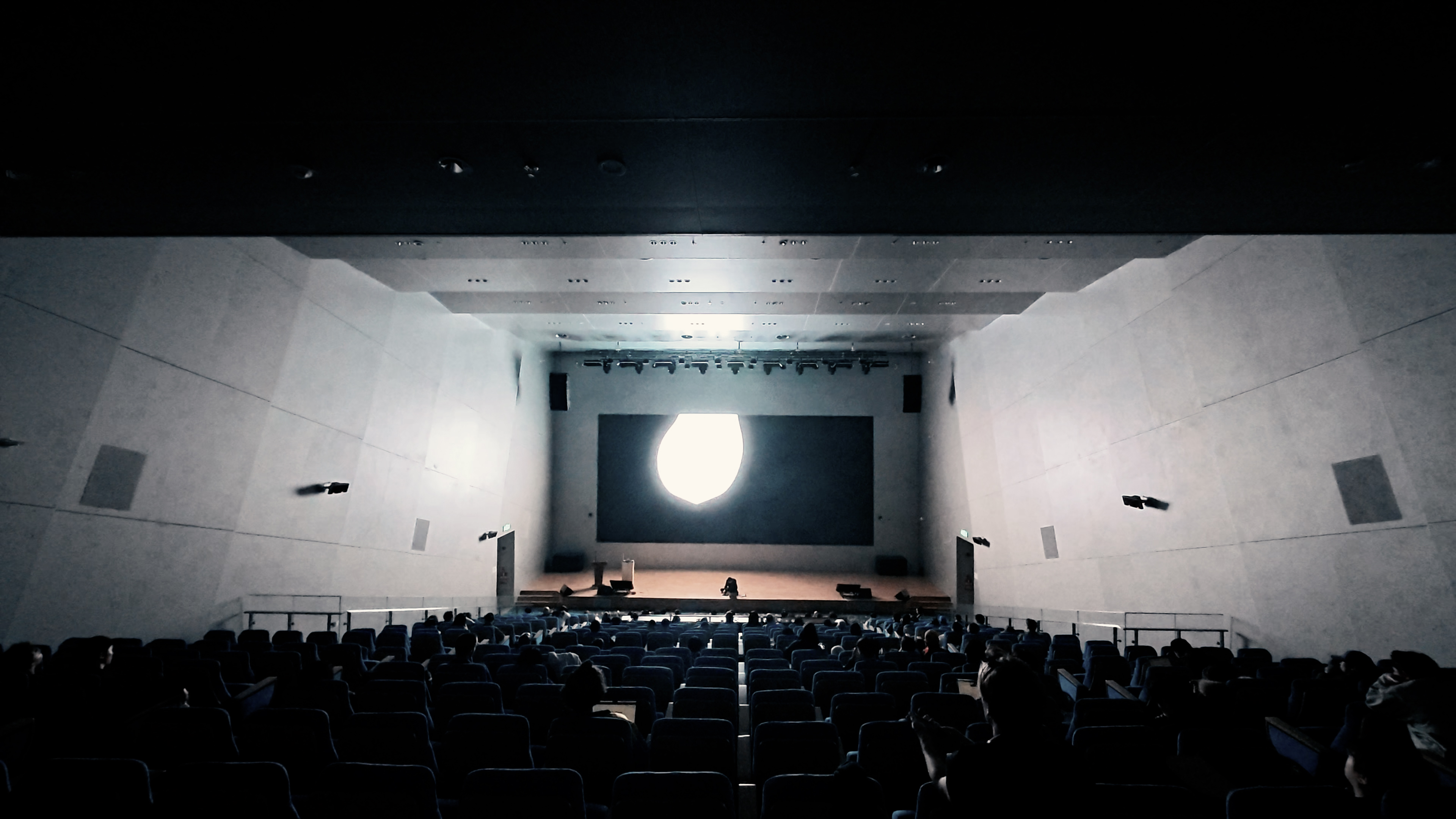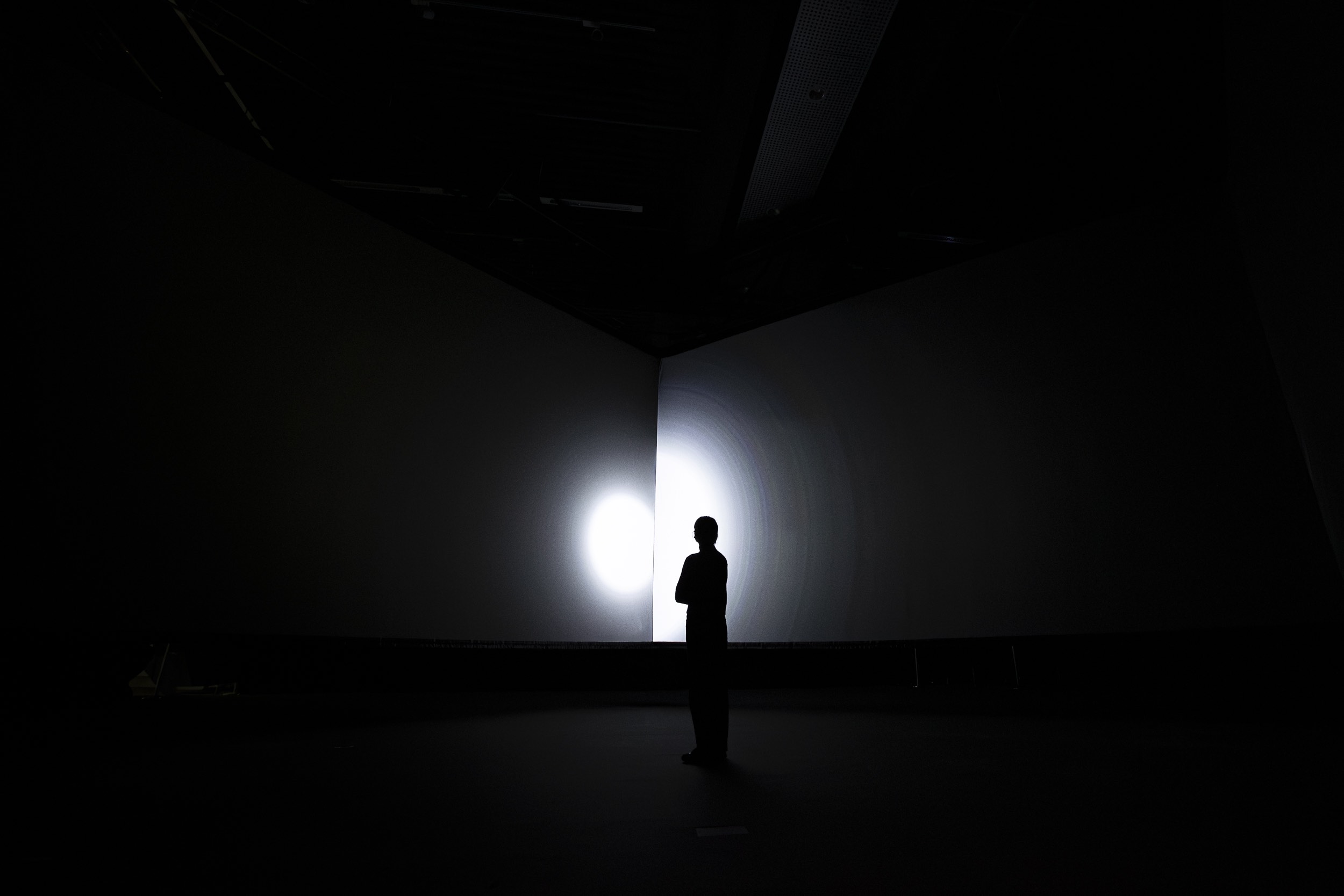 Diffusion begins where the image ends; in its disappearance the encounter between light and screen is made strikingly clear. The piece lives in space rather than on the screen, which merely shows the perceivable portion of what moves towards the invisible.