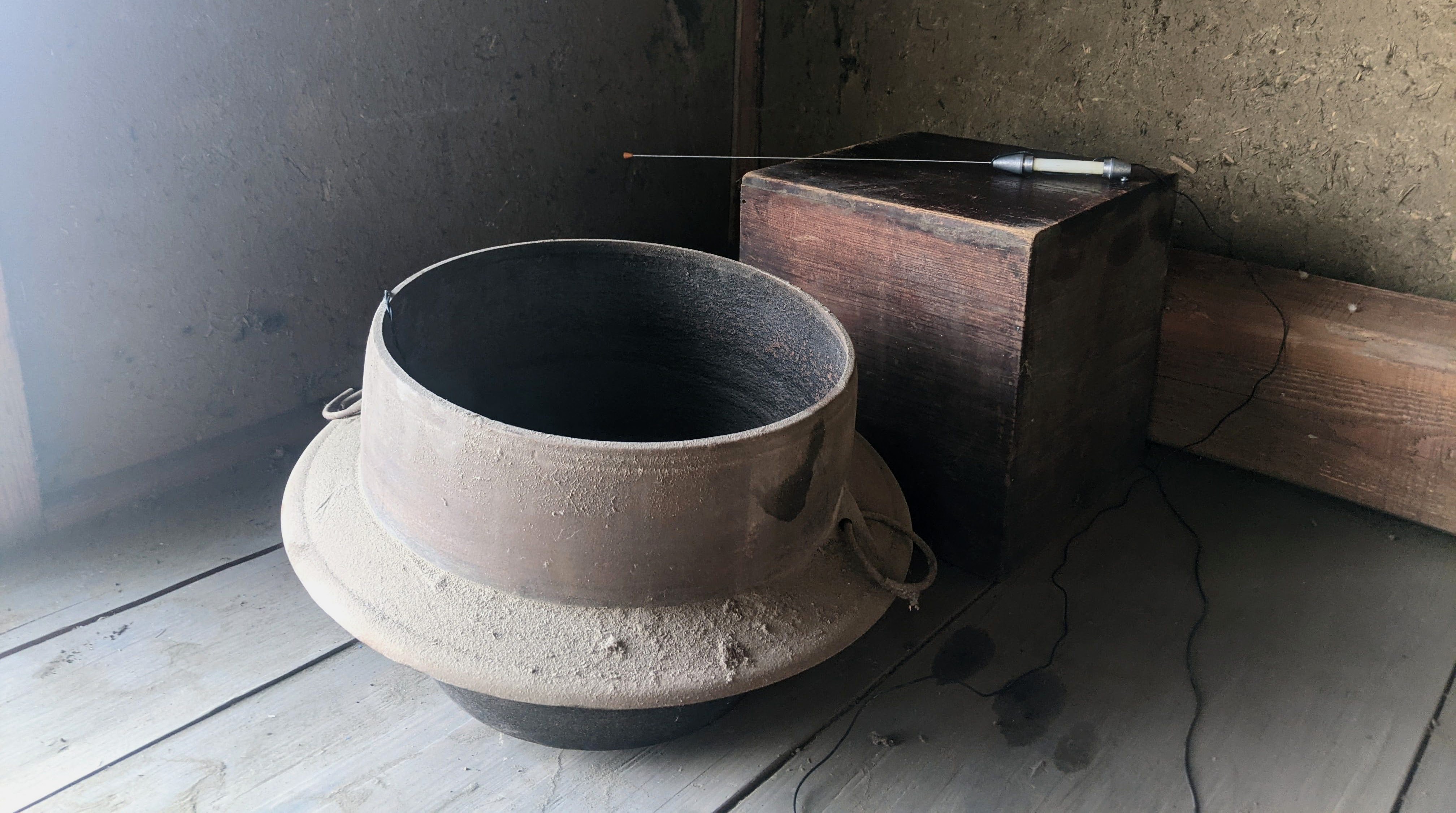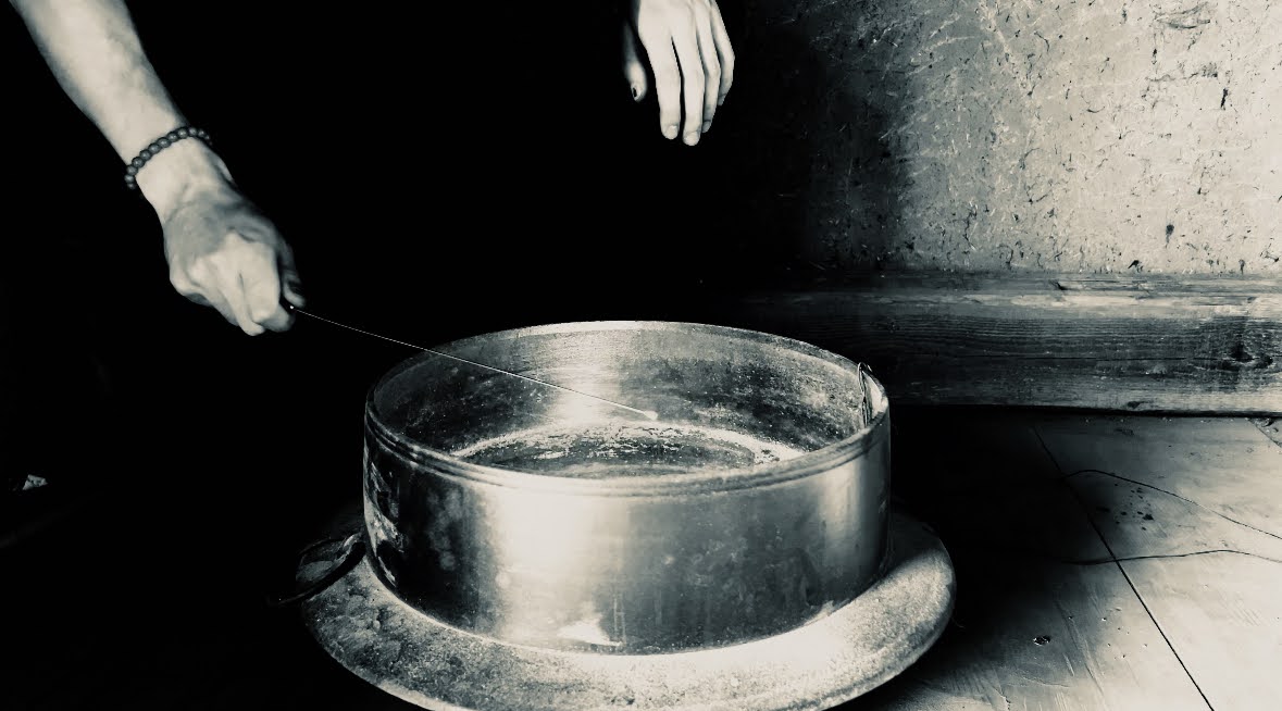 An analog audiovisual performance where an old Japanese iron cooking pot becomes an instrument connected to a light and speaker. Touching the pot with a metal stick closes the circuit, producing light and sound, embodying the energy brought through and forth from the pot.